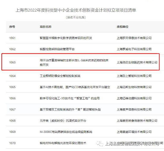 近期,上海市科学技术委员会组织的“上海市2022年度科技型中小企业技术创新资金计划”拟立项项目名单公示完毕,九州酷游 ku游生物“用于治疗重度哮喘的全新长效IL-5纳米抗体药物的临床前开发”项目入围。